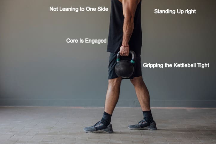 -Starting out to grab the weight to carry it, don’t ever just bend at the back to pick it up. Work that hip hinge or squat we talked about earlier! Your back will thank you.